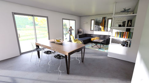 Aménagement d'une maison neuve au RDC avec une piece toute en longueur et ouverte uniquement sur 2 façades.